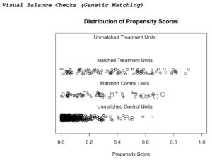 Not to bore anyone with the details but we used matching to get closer to a true causal inference (not that we expect to succeed – but at least get a more reasonable comparison). Propensity matching sucks (and no, we did not try higher order interactions and machine learning to find best model), as usual Coarsened Exact Matching (as implemented and without tweaking) throws away most of the treatment group (not exactly something we can afford to do now) and, as anyone could have predicted, Genetic Matching is still the method that saves the day with incredible balance and super interesting findings. (I guess findings were the same with a simple nearest neighbor propensity matching and tended in this direction with CEM as well but insignificant due to probably the very low sample size.)